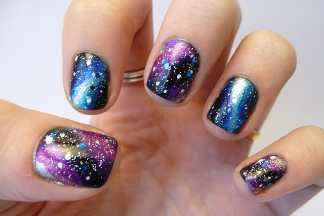 Calling all ladies with a sizable nail polish collection: this one’s for you. While this tutorial uses a total of seven different polishes including glitter to top it off, you can customize it and make it your own with as few or as many hues as you want. You’ll also need a makeup sponge, a toothpick, some q-tips and nail polish remover on hand. To start, paint your nails in black. Once they’re dry, it’s time for the fun part. Take a makeup sponge and pile on silver, blue and bright purple nail polishes. Finish off the look with your “stars,” a.k.a. white dots using a toothpick and a light coat of gold or silver glitter. Clean up any polish on your cuticles with a q-tip dipped in polish remover.
